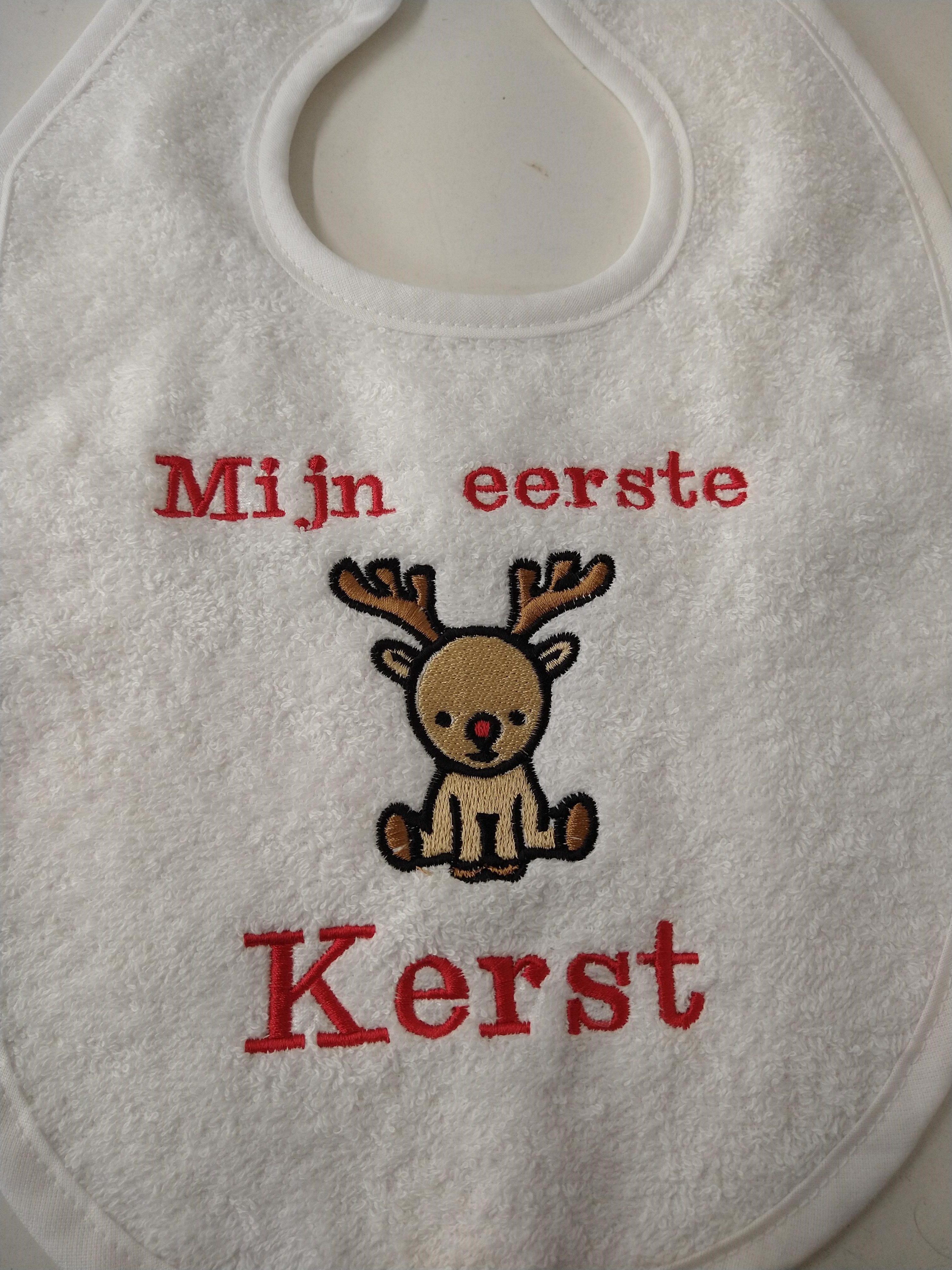 Badstof slabber wit. Formaat 25×40. Tekst borduur “Mijn eerste Kerst”.