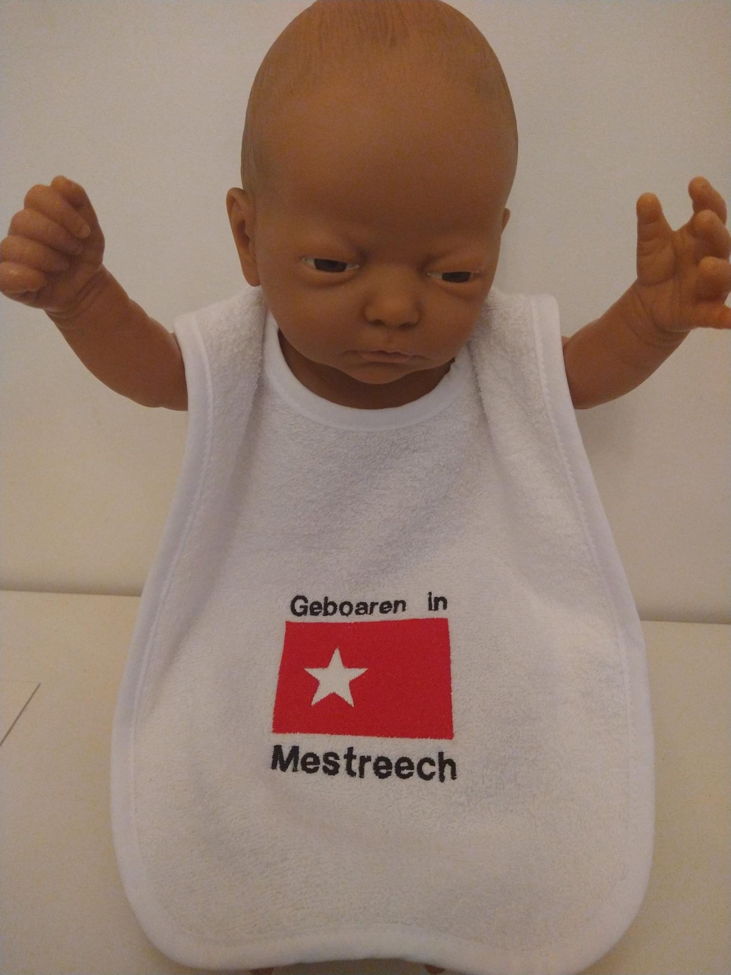 “078 Badstof slabber badstof wit 25×40. Geborduurd “Geboaren in Mestreech”