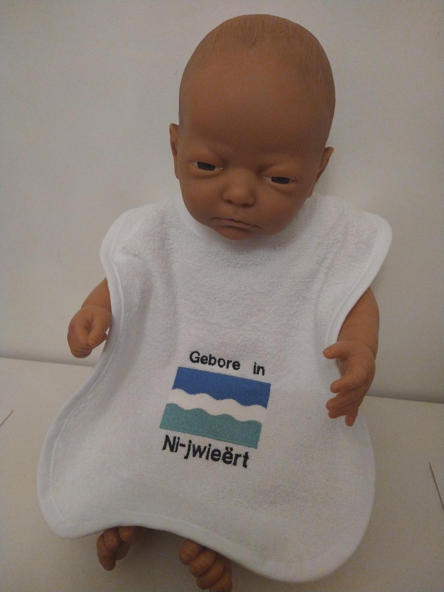 Badstof slabbertje in wit badstof formaat 25×40. Geborduurd “Gebore in Ni-jwieert.”
