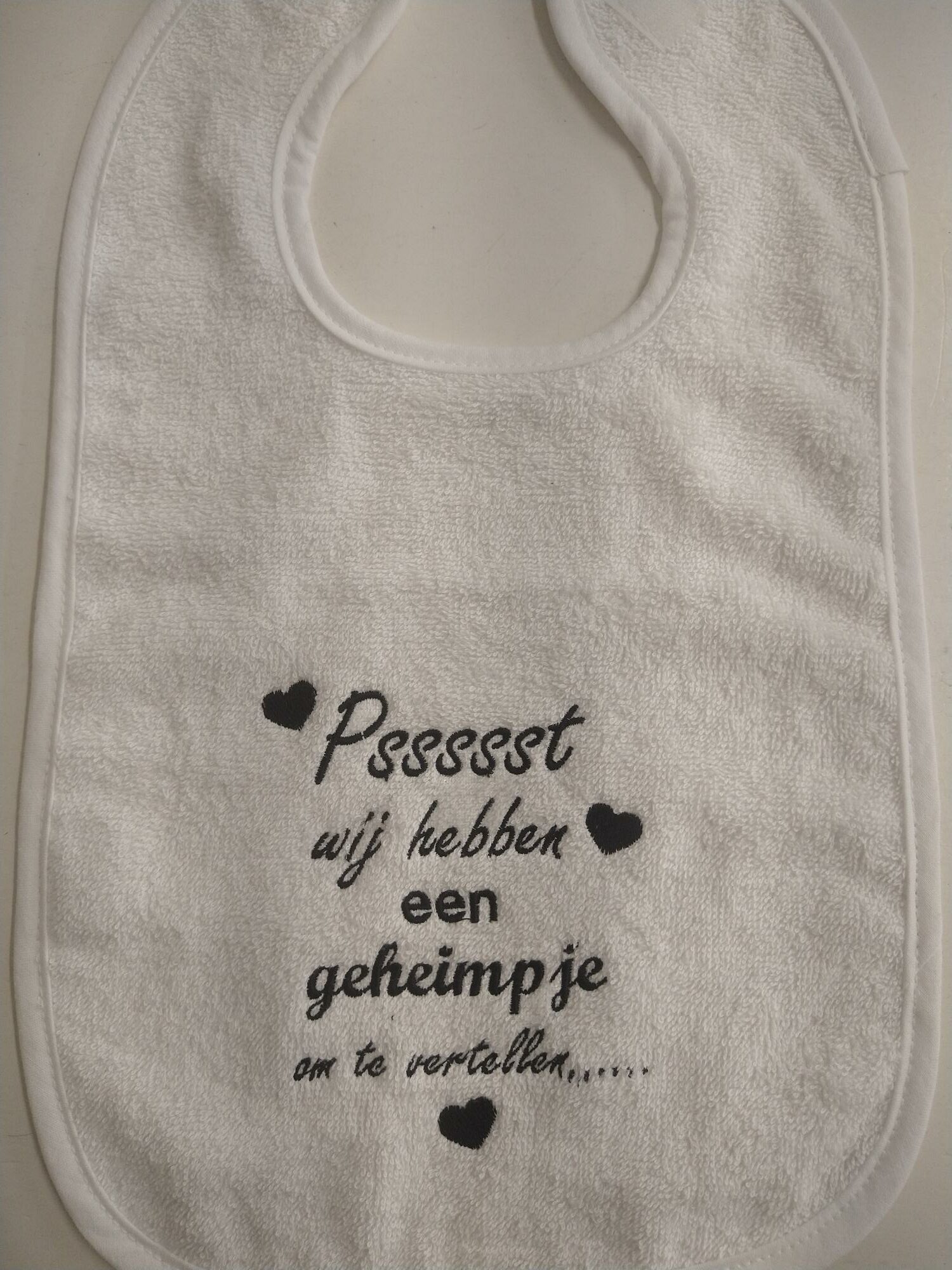 Badstof slabber wit in formaat 25×40. Tekst in borduur. Normaal wasbaar.