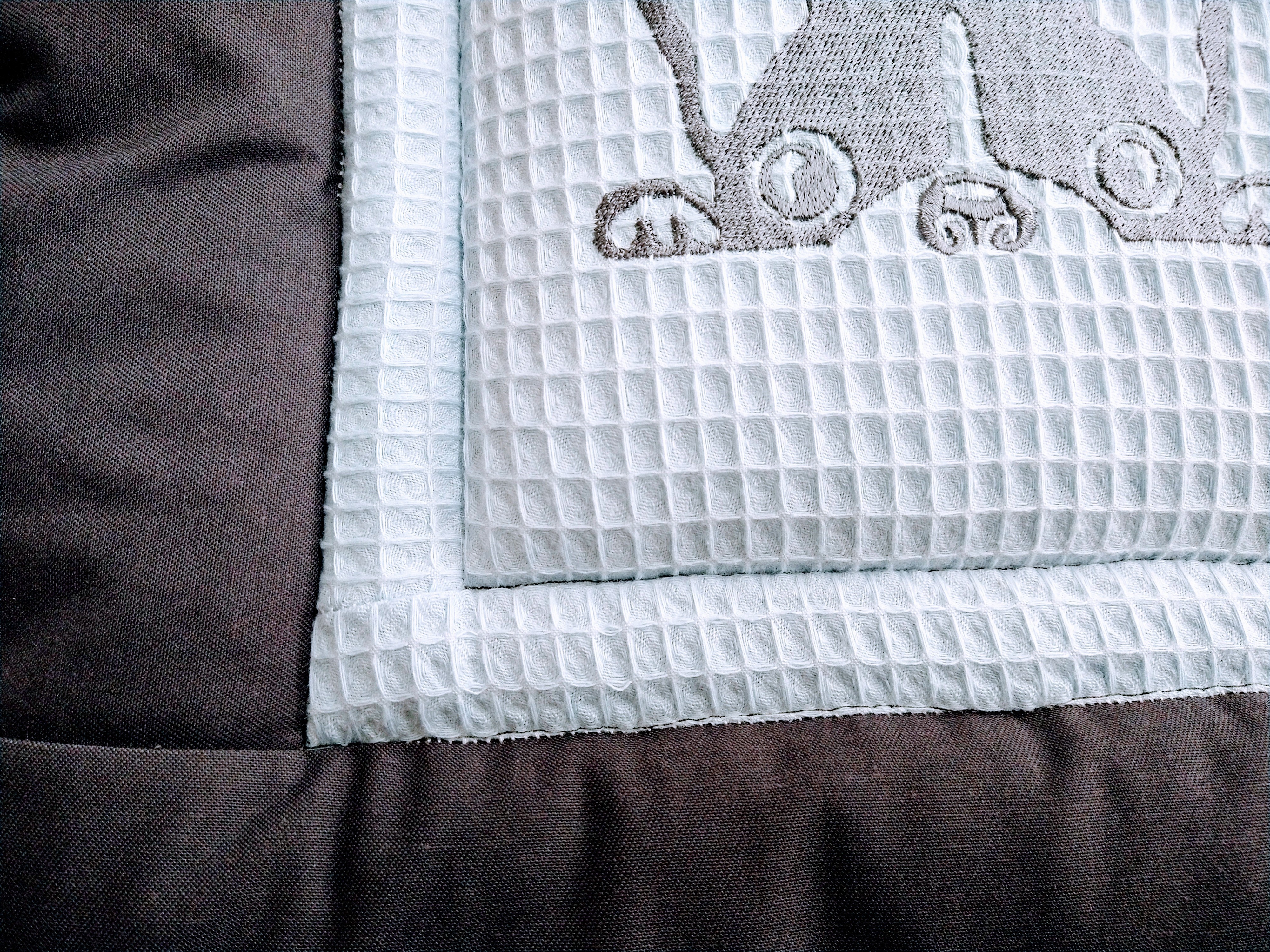 Boxkleed Hondje gluur in formaat 75×95. Effe stof katoen antraciet, wafelkatoen aqua met borduur hond in antraciet.