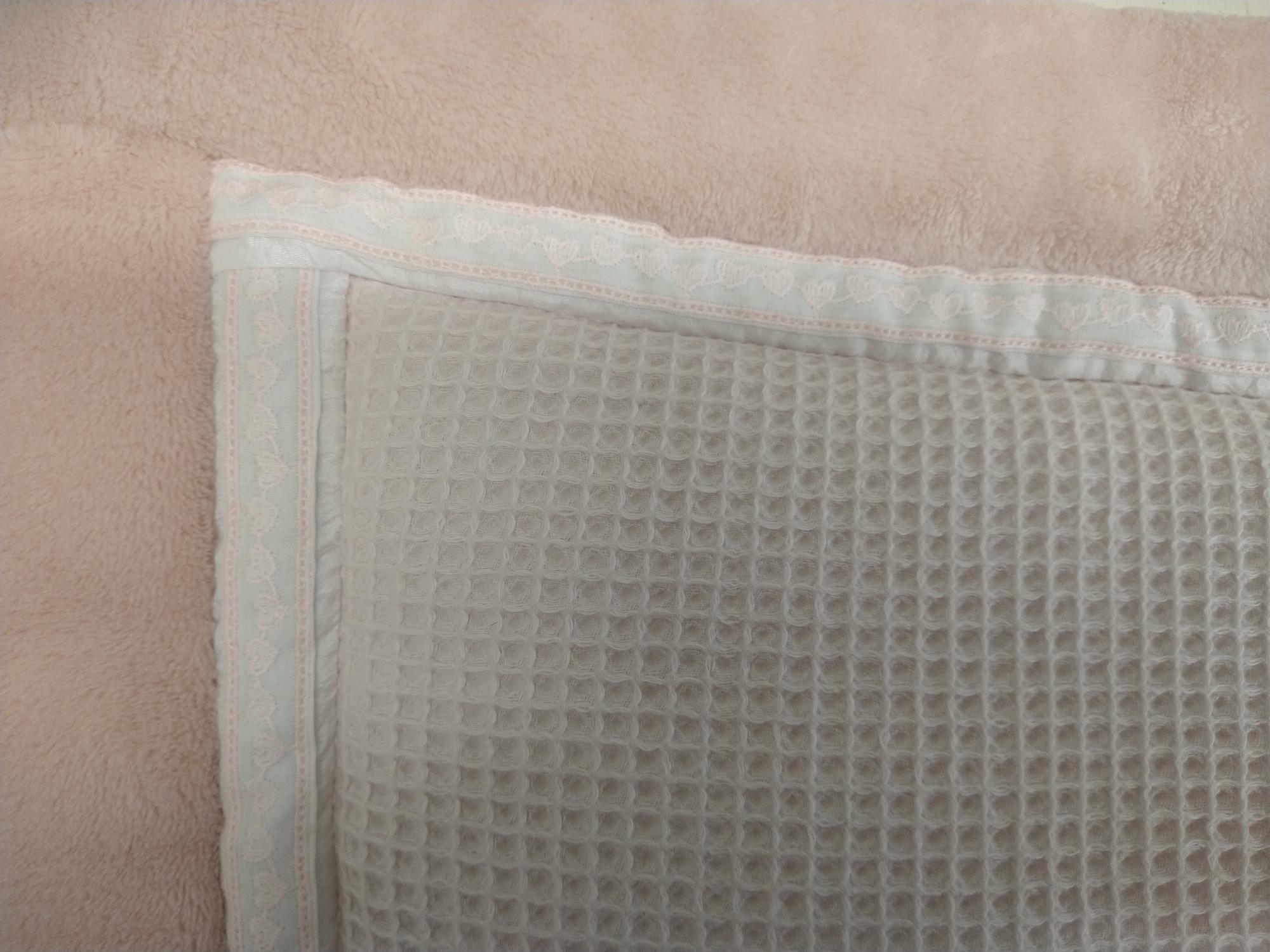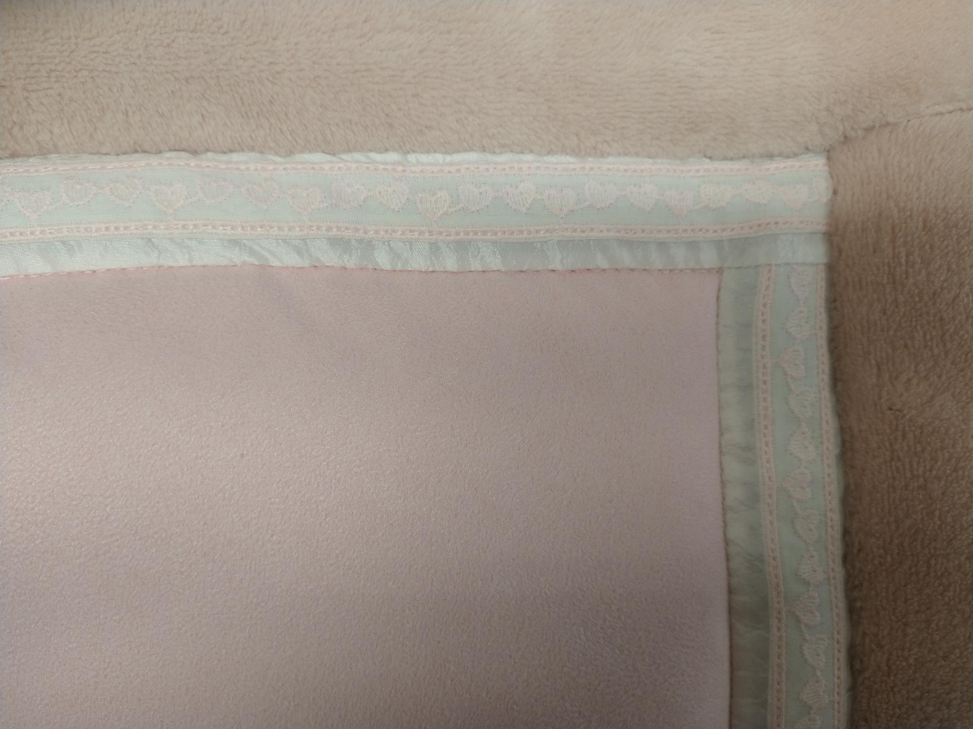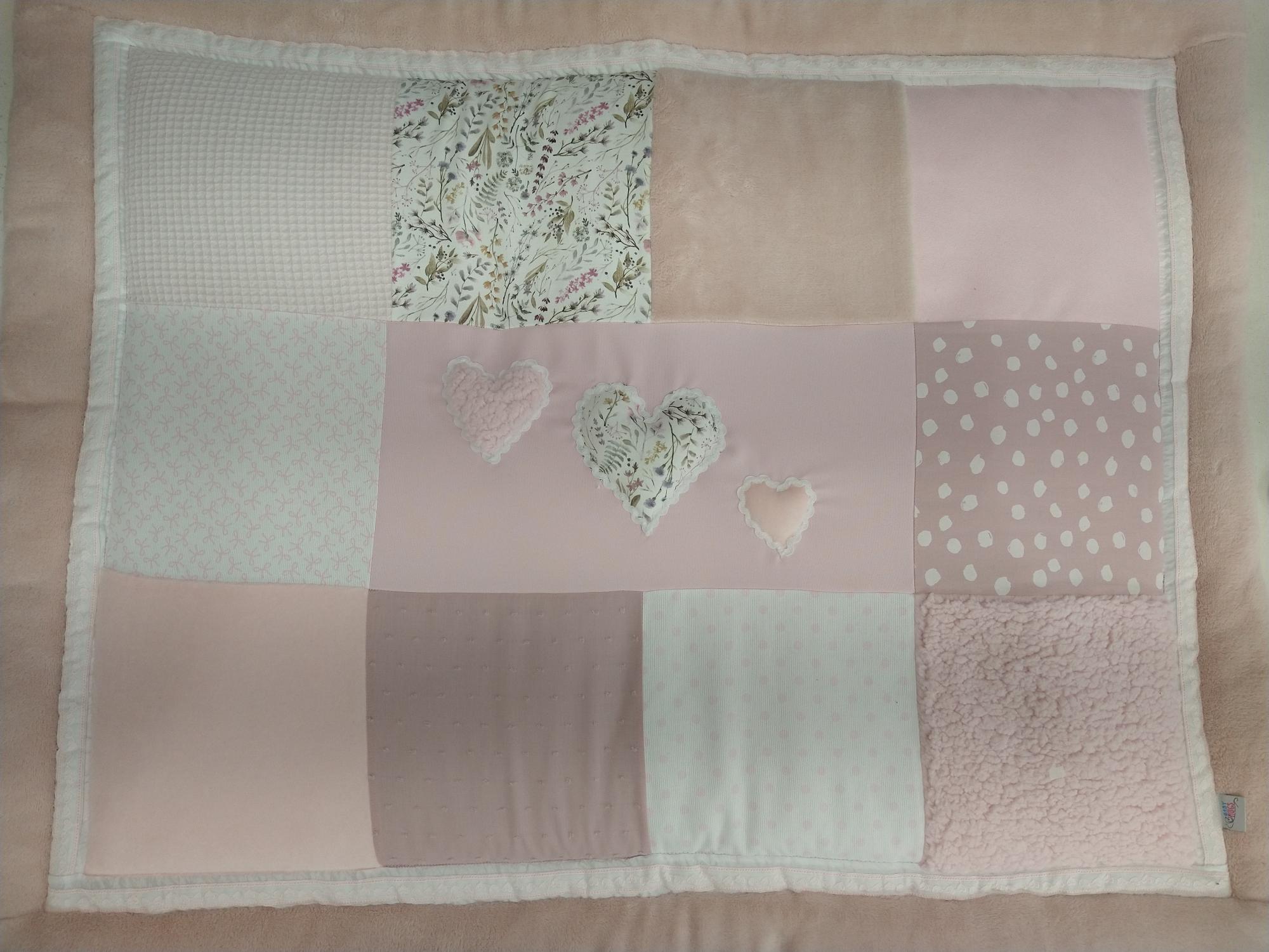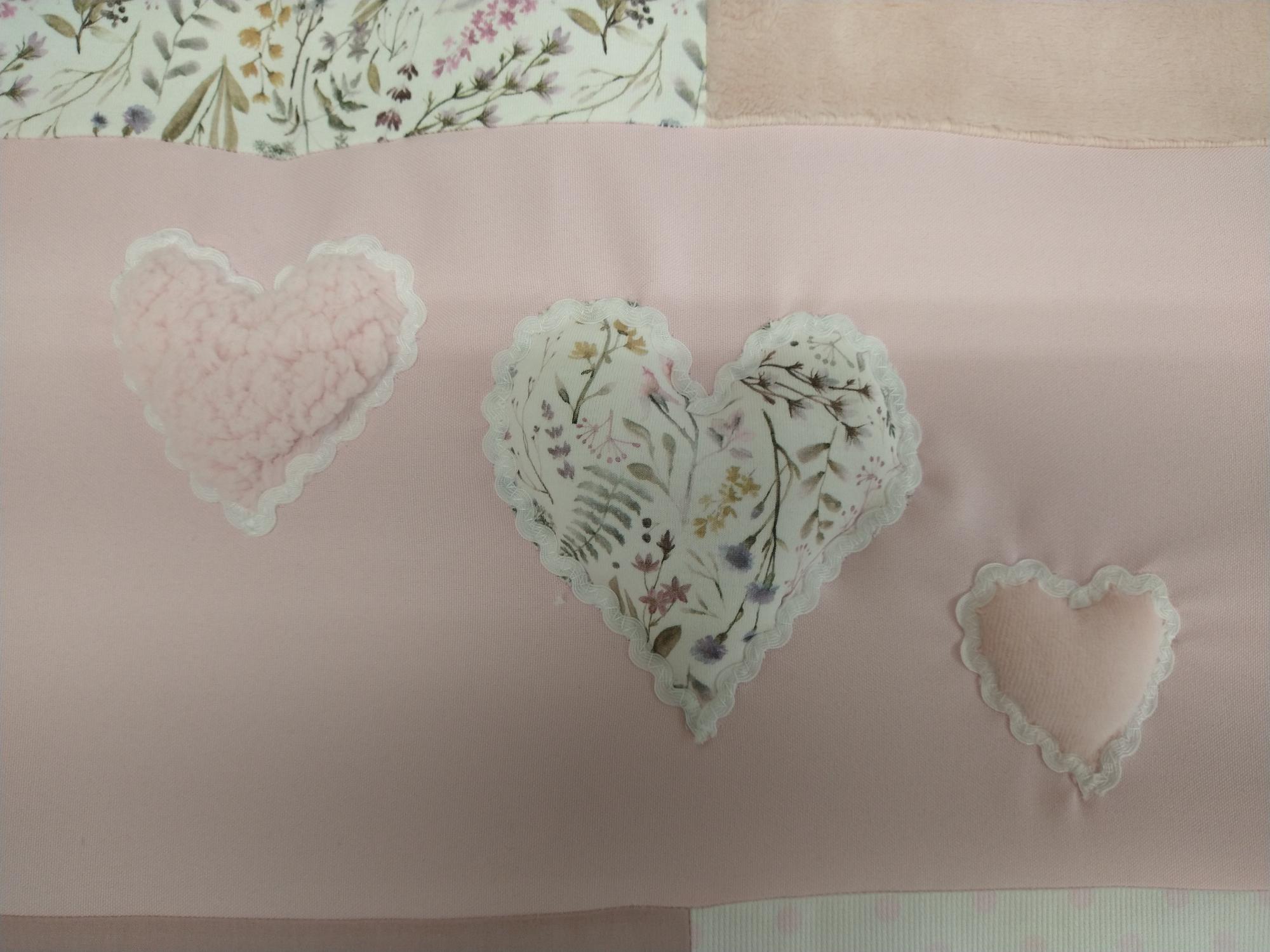 Boxkleed 3D roze hart patchwork in diverse dessin blokken. Formaat 75×95 (standaard). wasbaar op 30 graden. Liggend drogen.