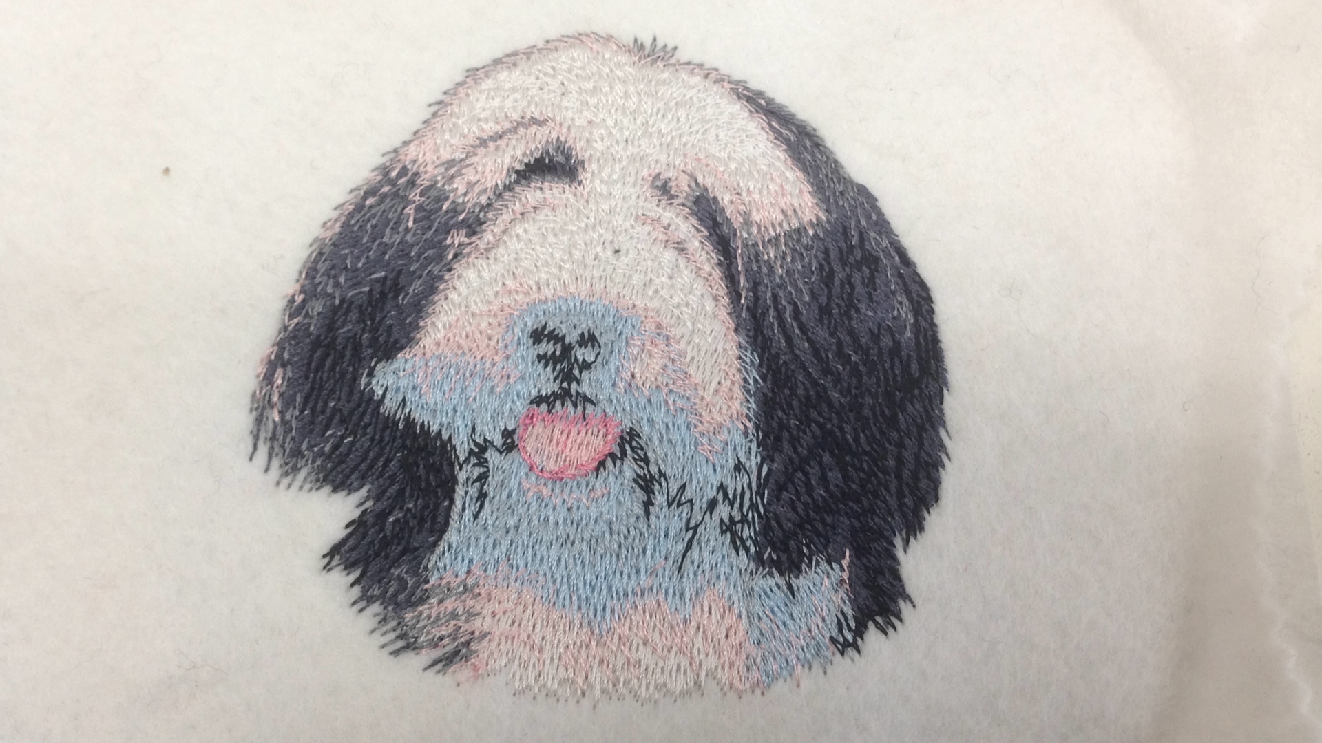 Geborduurde Bearded Collie. Kleur mag u zelf bepalen. Formaat 10×10. Grotere afbeelding in overleg.