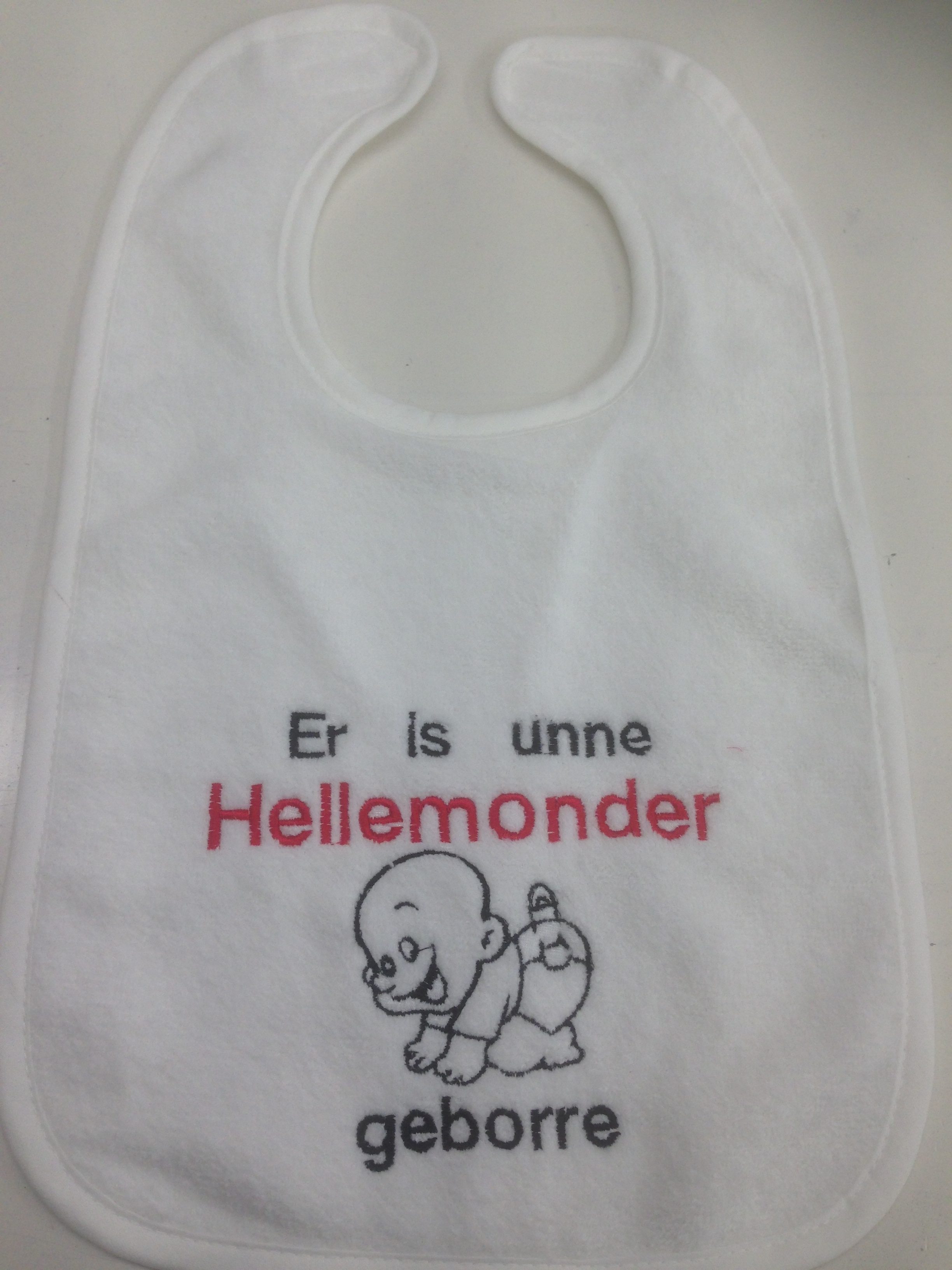Slabber badstof met klittenband. Tekst geborduurd “Er is unne Helmonder geborre”.